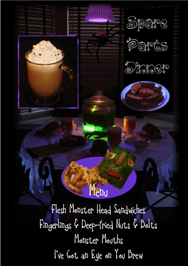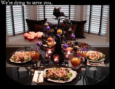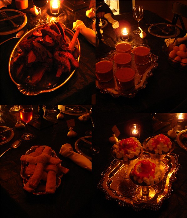Upper left is the Steak on a Stake, followed by tomato-basil bisque and roasted garlic potatoes, crusty bread crucifixes, and topped off with Fluffy the Vampire Slayer mousse. I wished I had purchased the round mirrors to use as placemats. Ran out of time, but if we do a vampire dinner again, I will definitely use that idea.